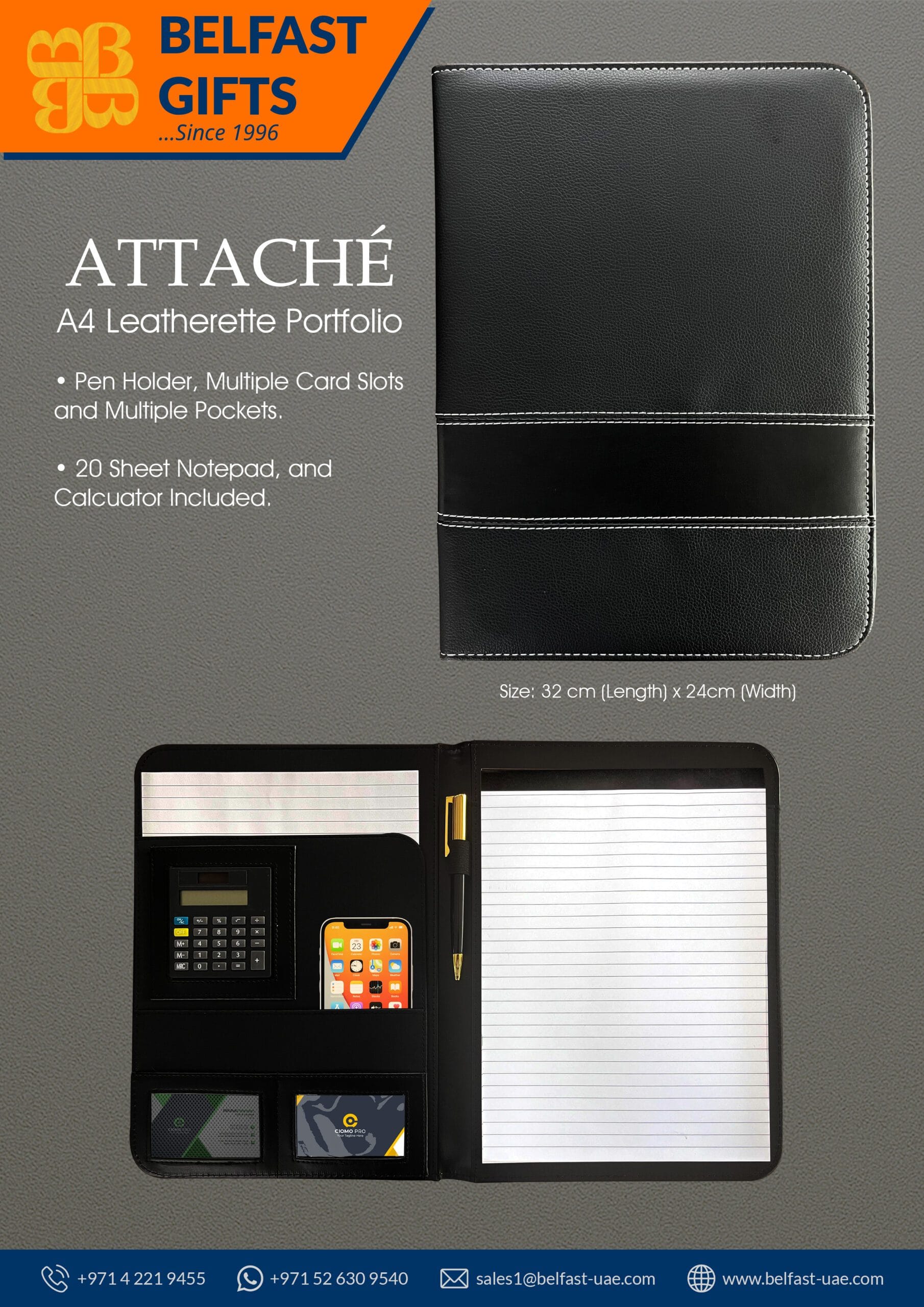 This clean, elegant leatherette A4 portfolio/folder comes with pockets on the inside cover, card slots, a pen holder, a notepad, and an attached calculator. Luxurious organising- the key to smooth functioning. Customise the cover with elegant embossing/debossing or printing of your company name/logo, and they’re ready to use!
