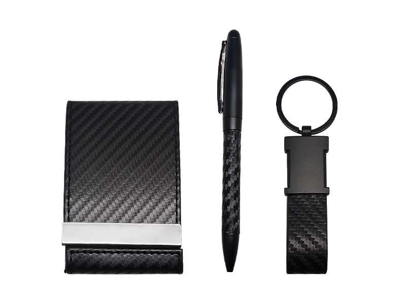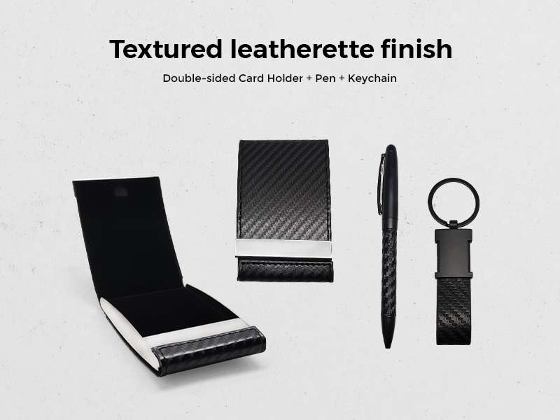 Carfi – the classic set of cardholder + keychain + pen in a set box. Make a statement with the accessories you carry. This posh-looking Textured leatherette card case gift set will do just that.