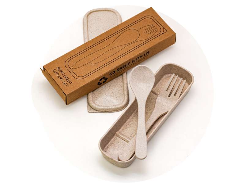 Cutlery set of eco-friendly wheat fibre spoon and fork in a box. this cutlery set comes with a case that is perfect for picnics, take-out, camping, and carrying in your everyday bag to have an eco-friendly option ready when you need it.