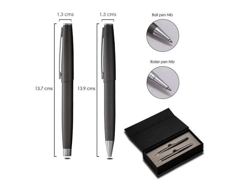 Elegance is a virtue of the gentleman. This matte grey-body pen set, consisting of a roller pen with matching ball pen, is elegant, expensive, and enchanting. Delivered in a luxurious box, this makes for an ideal high-end corporate gift. We make luxury accessible and affordable.