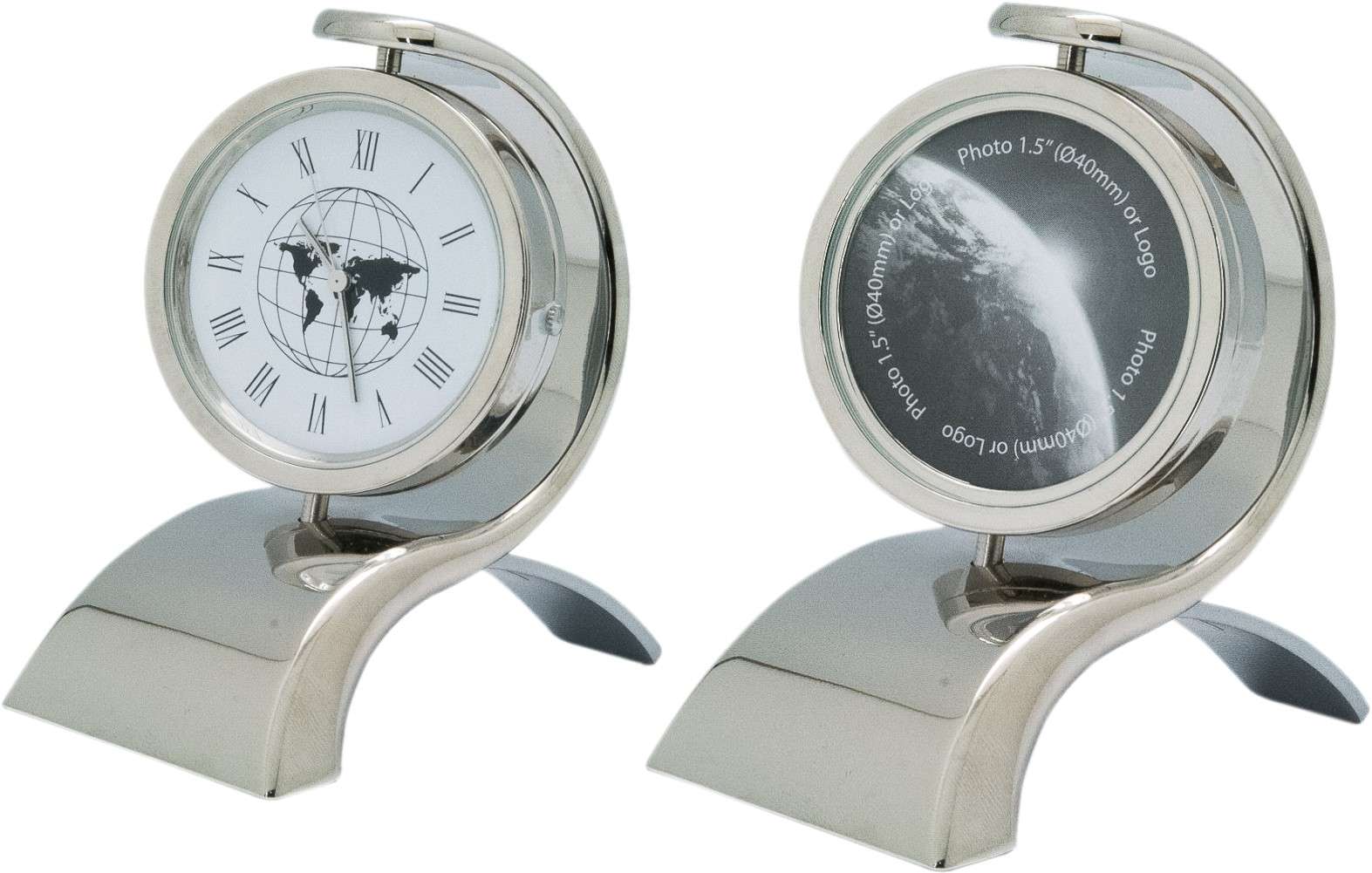 Shiny chrome base on which sits a rotating clock with back free for logo