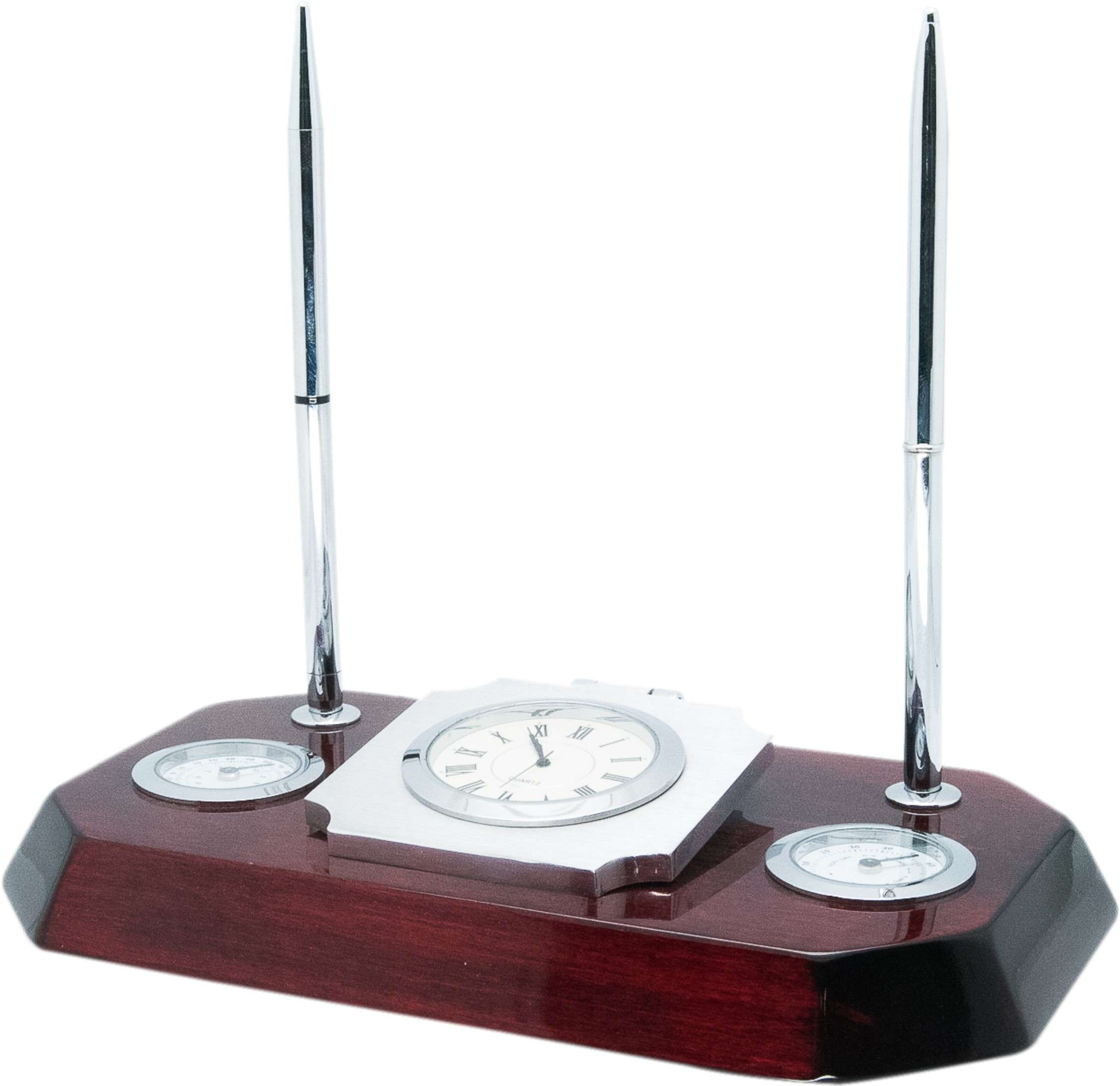 Desktop clock, thermometer, hygrometer, with compass below the clock, and double pen