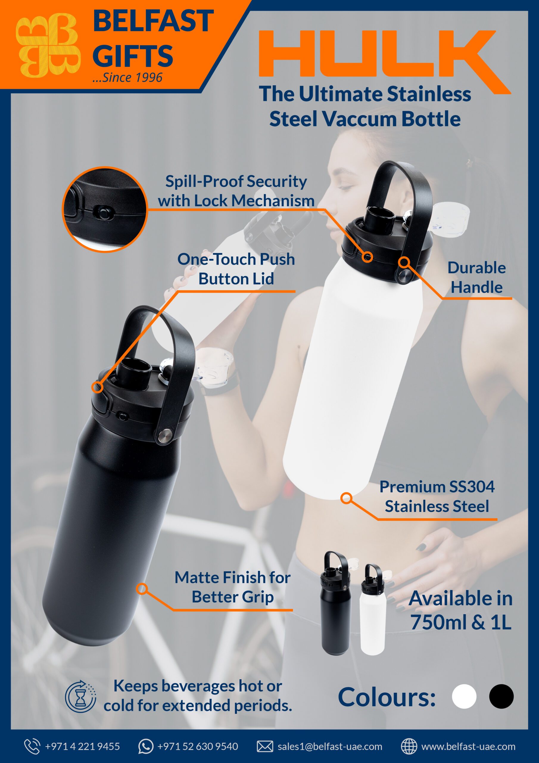 Available in 750ml and 1L capacities and classic black or white finishes, Hullk is perfect for branding with your company logo, helping your message travel far and wide.
