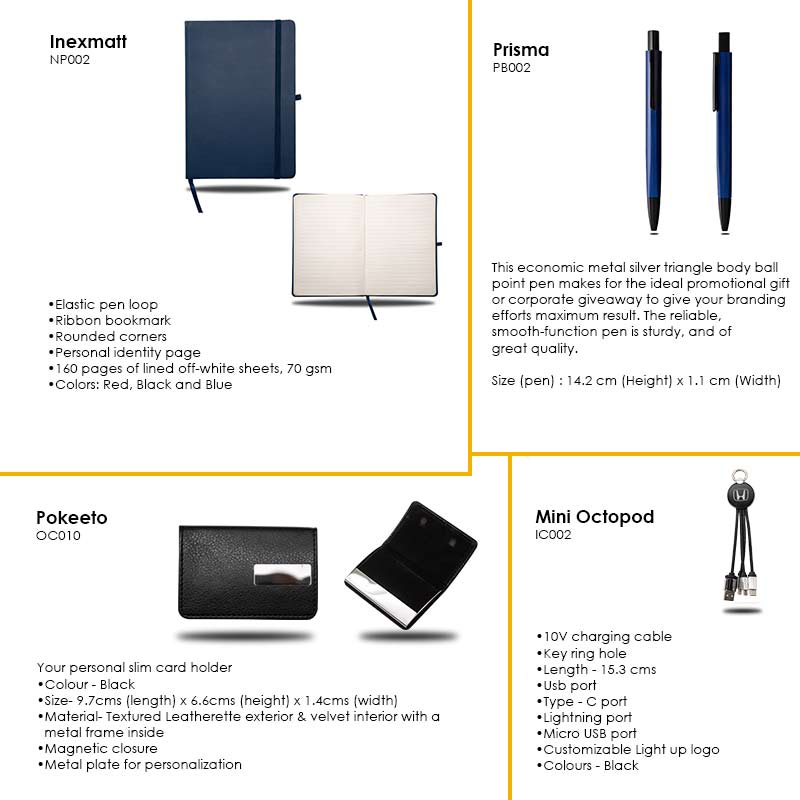 An economical hybrid gifting option with the right mix of modern tech gifts and classic corporate gifts. This gift set fulfils all business meeting needs with its notebook, cardcase, pen & a light up logo multi charging cable serving as a perfect branding option for company as well.