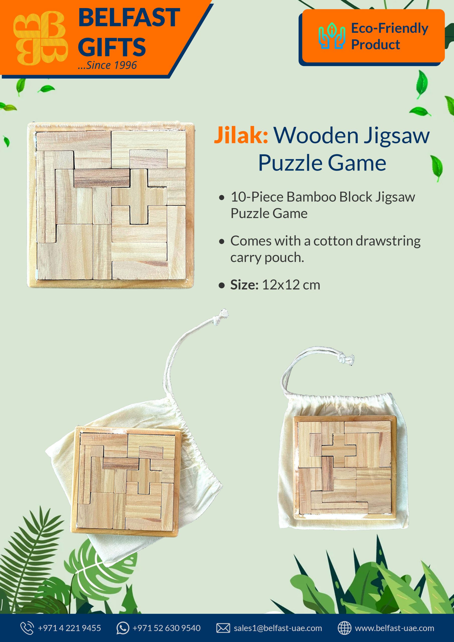 Add a creative twist to your promotional gifting with Jilak, a compact 10-piece jigsaw puzzle crafted from eco-friendly bamboo. Designed to entertain and challenge, this engaging brain teaser promotes focus, relaxation, and mindful breaks — making it a memorable addition to any corporate gift package.