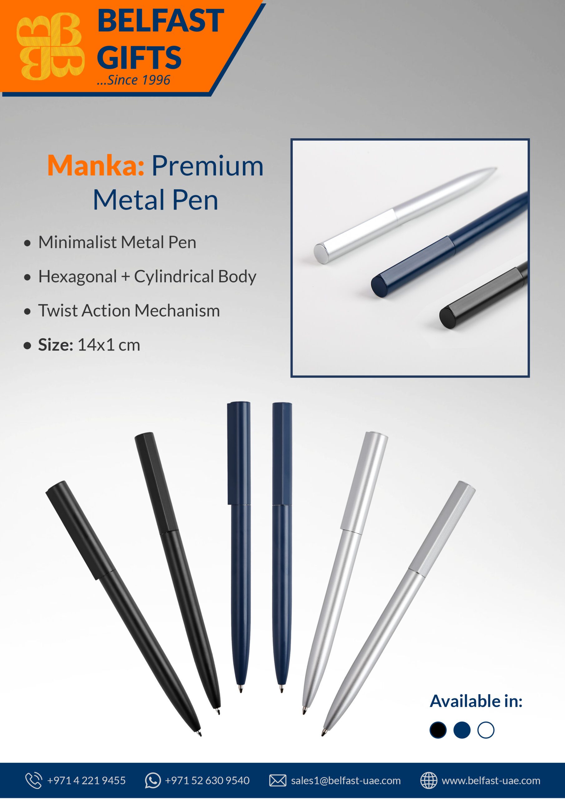 Available in three elegant shades — Blue, Black, and Silver — the Manka Premium Metal Pen is ideal for corporate branding, client gifting, or employee recognition. Its minimalist design makes it a versatile choice for both formal and casual use, while the premium build ensures long-lasting value.
