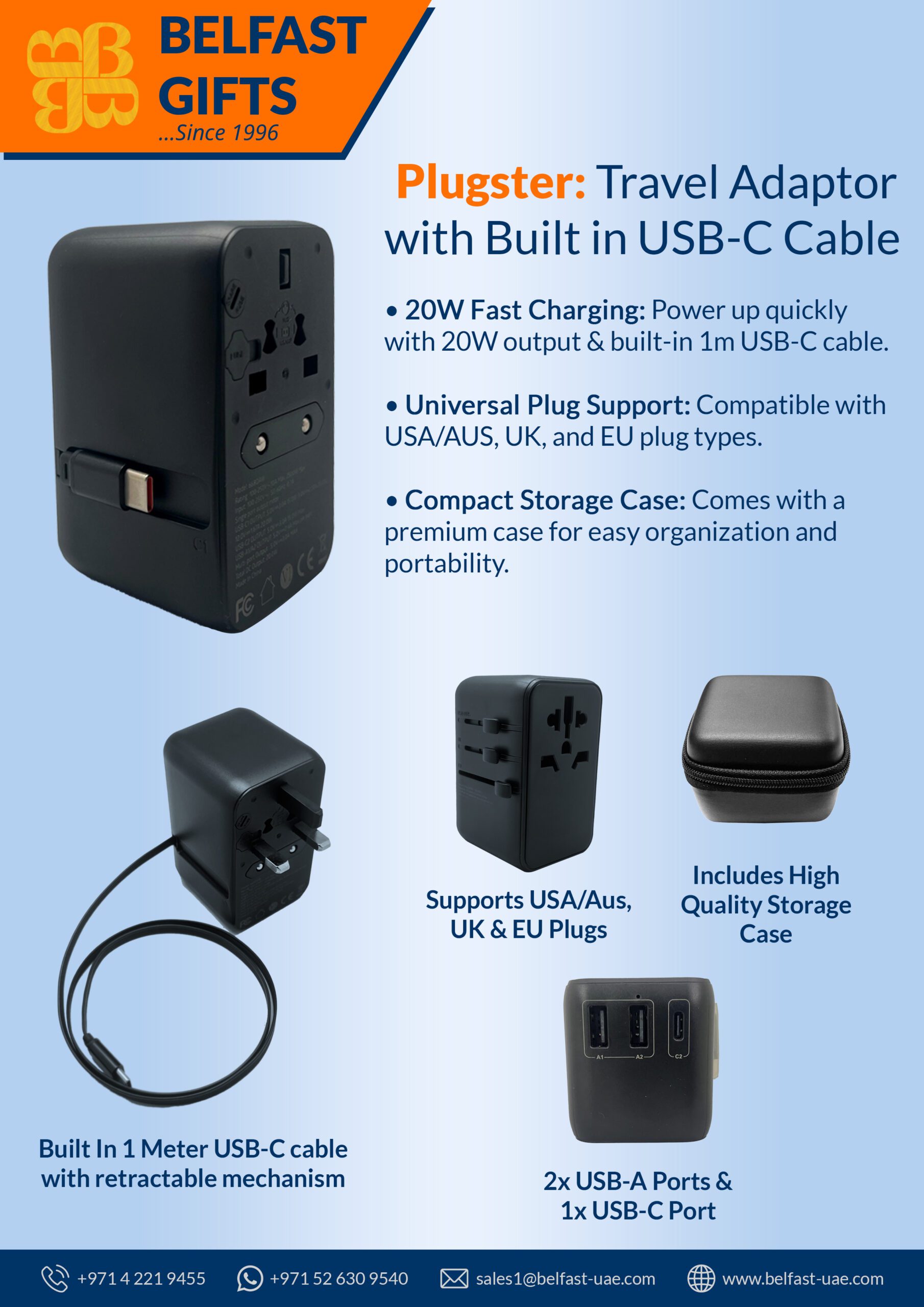 This versatile adaptor supports plug types for over 150 countries, including USA/AUS, UK, and EU standards. The built-in 20W USB-C port and integrated 1-meter USB-C cable allow you to quickly power up smartphones, tablets, laptops and more at maximum speed. When not in use, the adaptor stores neatly in the included premium case for effortless portability.