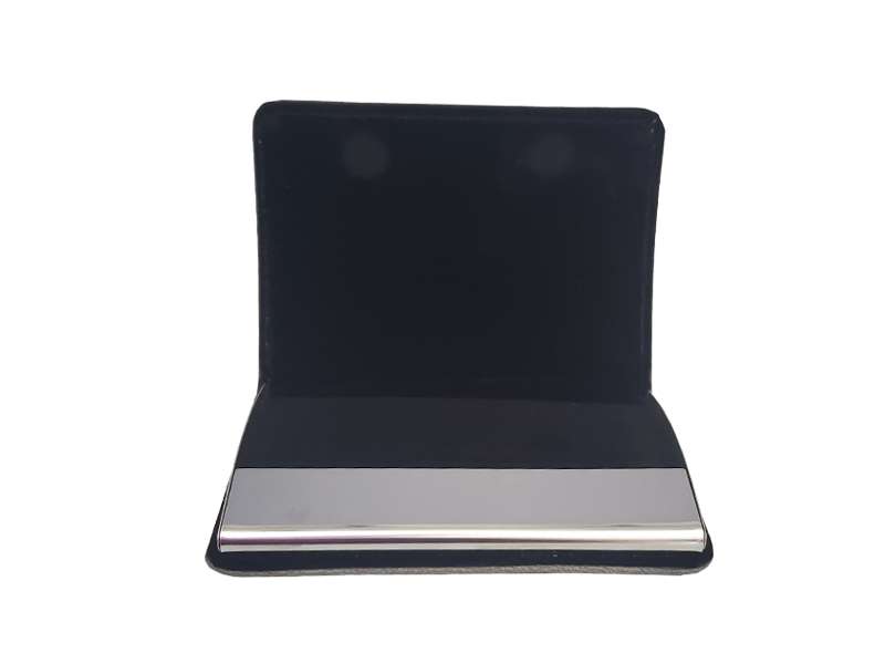 The case features a sleek black PU leather exterior and a brushed gunmetal metal frame. The metal frame provides a durable and secure fit, while the PU leather offers a luxurious feel and look. The inside of the case is lined with a soft velvet material to prevent your cards from getting scratched or damaged. The case is equipped with a secure snap closure to keep your cards safe and secure.
