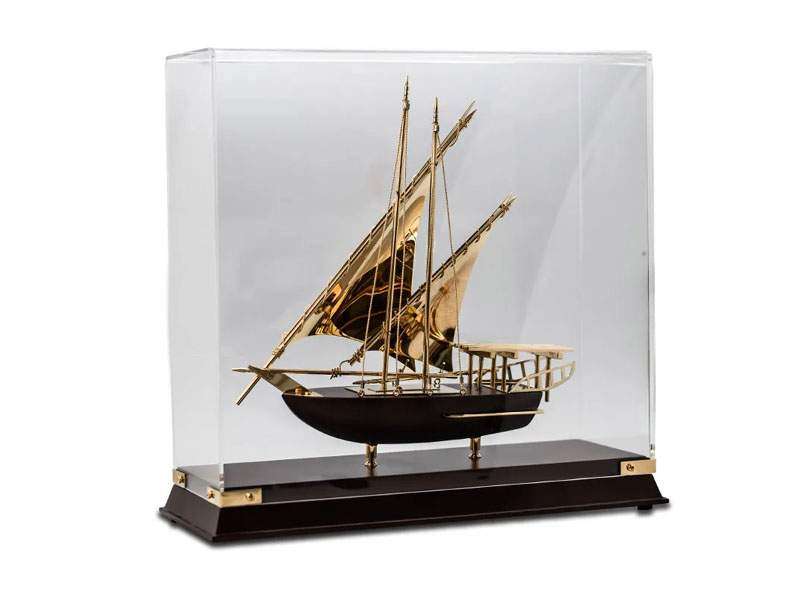 Wooden & Metal model of a Traditional Arabic dhow (Mintaka boat) placed in an acrylic/ wooden golden case. Making it an appropriate executive farewell gift for a retiring staff or employee recognition souvenir. Available in ready stock for wholesale as well.