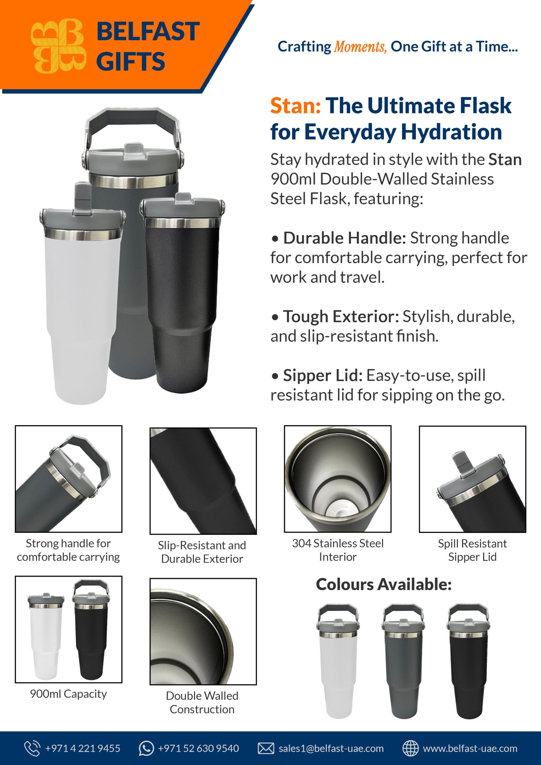 Stay hydrated in style with the Stan 900ml Double-Walled Stainless Steel Flask, featuring: