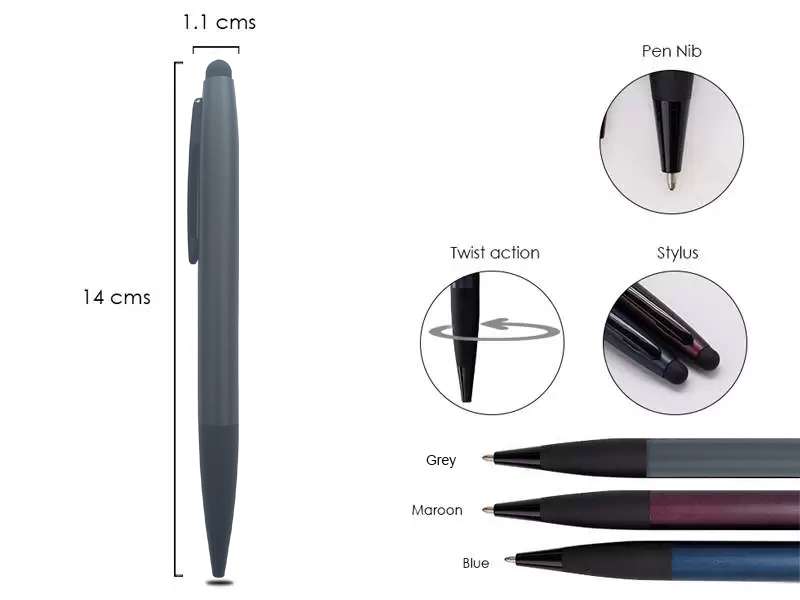 Simple, elegant, and reliable, this twist-action burgundy matte-finish ballpoint pen with stylus is an elegant take-away. Customize them with your company logo, and you have a memorable promotional giveaway.