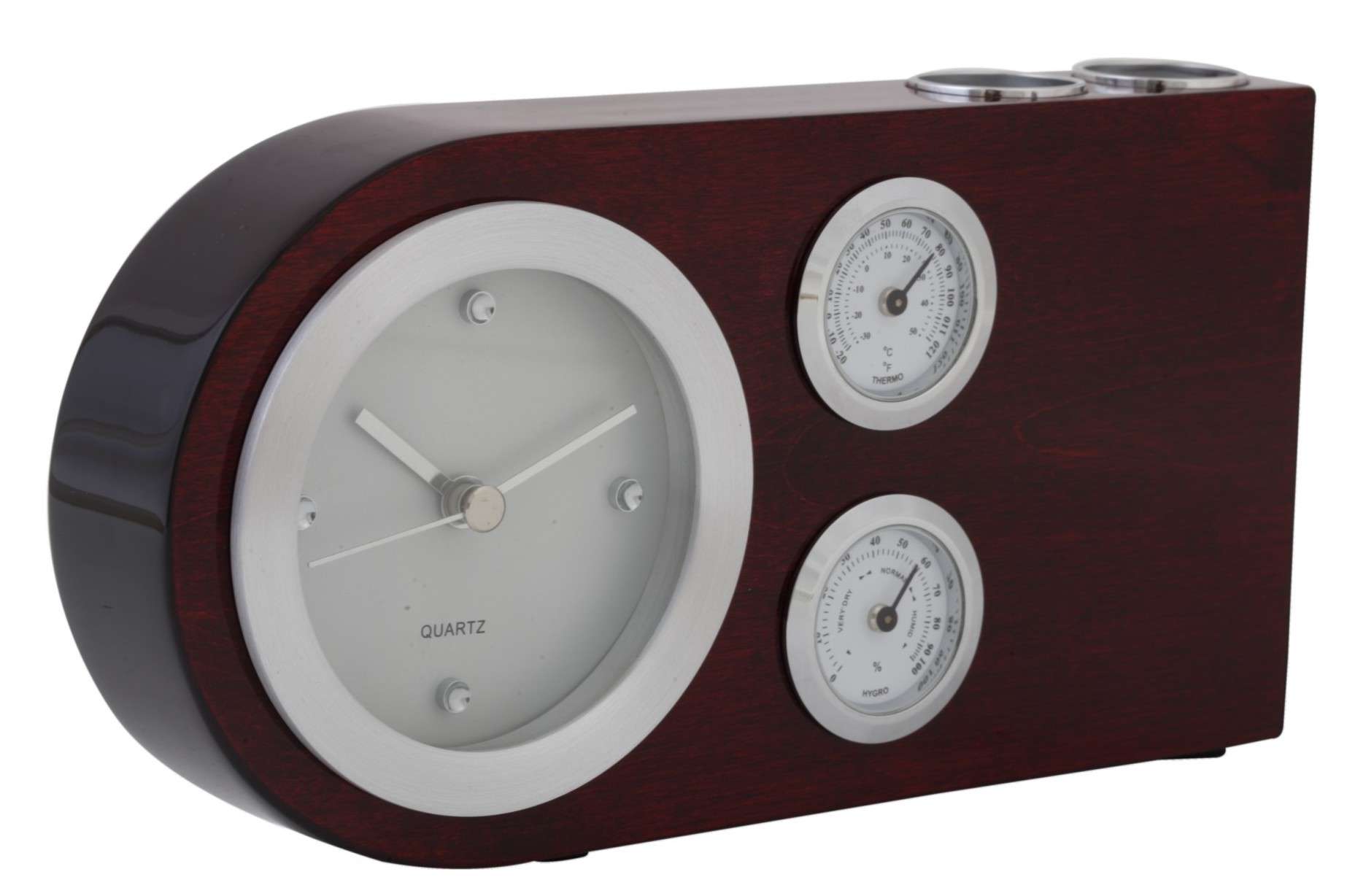 Wooden desk top clock, thermometer, hygrometer with double pen stand on the top